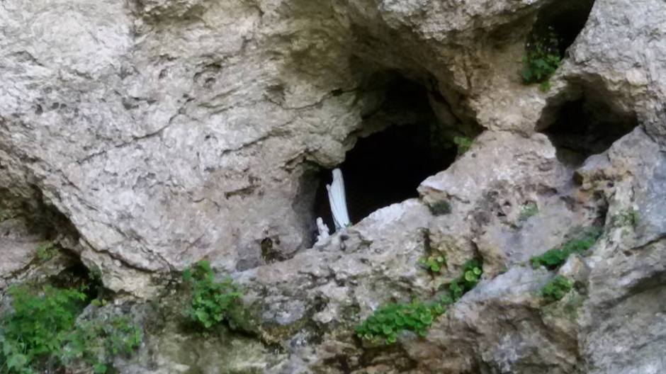 Questa parete rocciosa è letteralmente invasa da piccole Madonnine. Sono dappertutto: appoggiate come su scaffali o davanzali naturali, infilate nei pertugi più impensabili, aggrappate a sporgenze o persino appese. Dal basso, livello suolo, fin sù in posti dove chi ha voluto lasciarle si è dovuto arrampicare non poco. Madonnine, Rosari, immaginette sacre, ex-voto… Ma c’è dell’altro.
