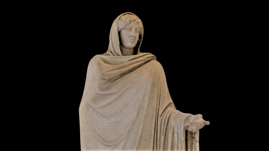 Si tratta di uno degli esempi più famosi della scultura greca di stile severo, che qui si declina in una compostezza dell’espressione del viso e soprattutto nel panno che chiude tutta la figura celandone completamente l’anatomia e lasciando alla luce la possibilità di scivolare morbidamente sugli ampi piani del tessuto. Come non soffermarsi, poi, sulle delicate pieghettature della veste sottostante che accarezza i piedi? Sembra di percepire il differente peso delle stoffe, il netto contrasto con il manto di panno che la ricopre rendendola quasi simile a una colonna e conferendole una monumentalità ancor più evidente e divina.