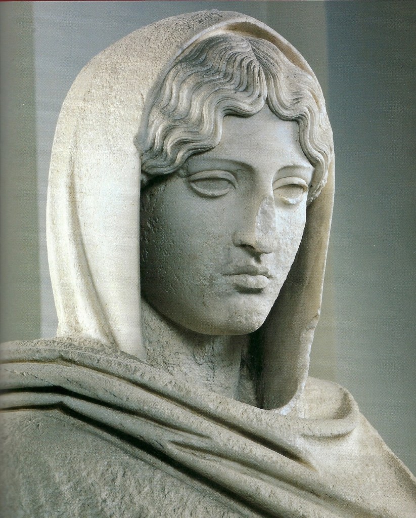 Soffermiamoci ora sul volto: austero e dolce allo stesso tempo, quasi una Madonna ante litteram. Un viso dal sapore magnogreco, con la mandibola forte, il mento squadrato, le labbra carnose ben disegnate e gli occhi grandi dalle palpebre spesse e marcate. I fitti capelli ondulati quasi “esplodono” dal pesante mantello suggerendo una potente femminilità volutamente celata ma non repressa. Fiera e delicata, questa straordinaria Afrodite emana un magnetismo vibrante cui difficilmente si può restare insensibili. O almeno, per me è sempre stato così!